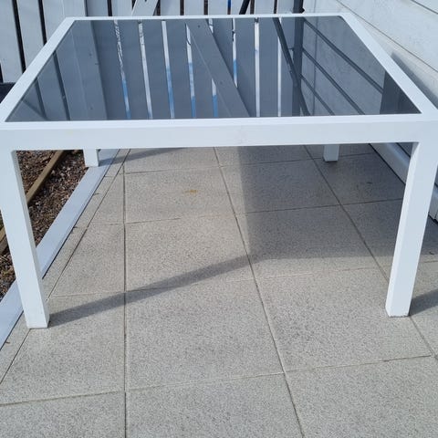 Laadukas, kallis valkoinen terassipöytä kestävällä maitolasilla. ( tempered glass) Karkaistu lasi, turvalasi.