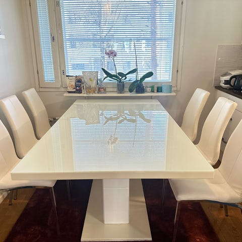 + 4 tuolia, kulutusta kestävää polypropeenia. Kankaan saa ruuvattua irti. Helppohoitoinen setti, huoltovapaat. Tuolit pesty myös. Ei kolhuja, naarmuja tms myöskään tuoleissa eri todella hyväkuntoiset, jopa uudenveroiset. Myöskään lasissa ei naarmuja. Lasikannen saa irti.
