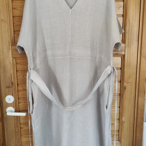 Bypias pellavatunika, naisten koko XXL. Materiaali 100 % pellavaa. Väriltään beige. Mekossa on pyöreä pääntie, 3/4-pituiset hihat ja etupuolella taskut. Kiva päällä, muutamia pellavalle tyypillisiä langannousuja ja nyppyä on, silti tyylikäs!