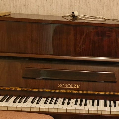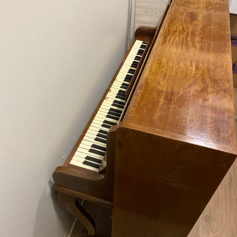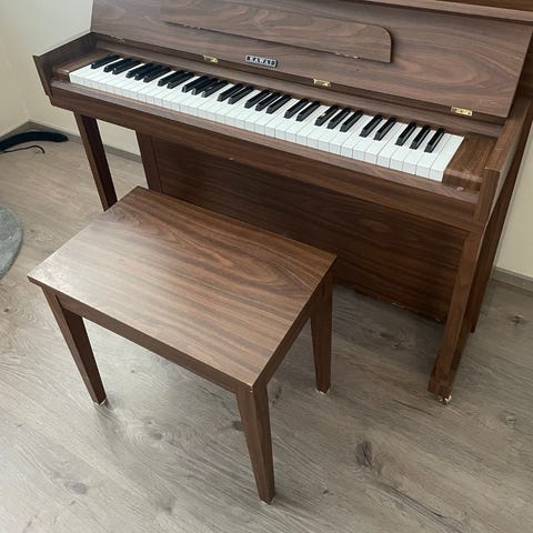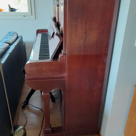 Pystypiano, jossa puuviilupinta ja perinteinen suorakaiteen muotoinen muotoilu. Piano sopii kotikäyttöön esimerkiksi olohuoneeseen tai harrastetilaan. Kuvassa näkyvä puinen tuoli voi kuulua kokonaisuuteen myyjän ilmoituksen mukaan. Merkin ja mallin tarkemmat tiedot eivät käy ilmi kuvasta. Vaatii virityksen.