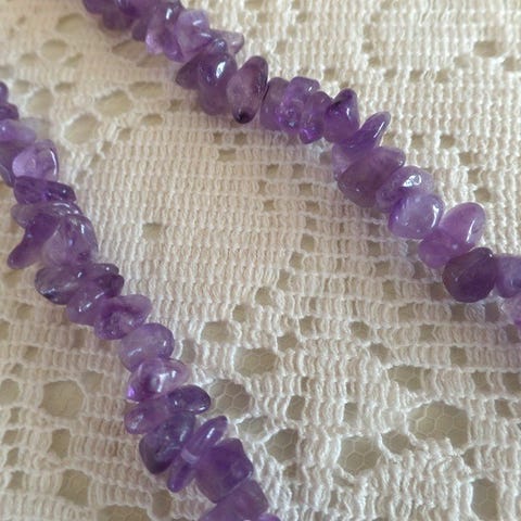Kaulaketjut rumpuhiotuista ametistikvartseista. Kaulakorun pituus säädettävissä n. 47-55 cm välillä. Käyttämätön ja siistikuntoinen. Ametistien pituudet n. 10-23 mm.