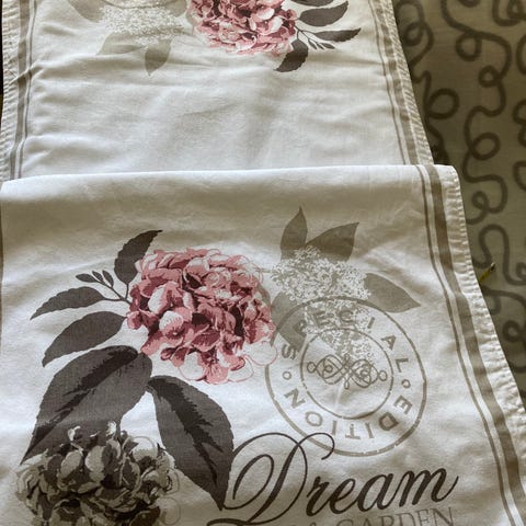 Kankaassa on koristeellinen, barokkityylinen kuviointi ja päät on viimeistelty tupsuilla, hieman kiiltäväpintainen kangas, materiaalitietoja ei ole.