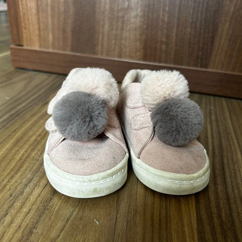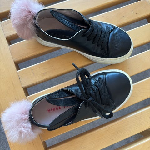Minna Parikka lasten tennarit tytöille, koko 26. Mustat nauhakengät, joissa vaaleanpunainen sisäpuoli, pupunkorva‑yksityiskohdat ja vaaleanpunaiset pörröiset tupsut takana.