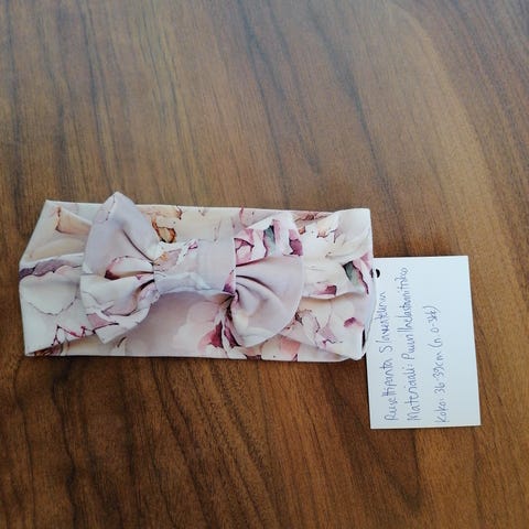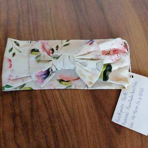 Rusettipanta kauniin murretun tummansinisellä kukkakankaalla. Rusettipannan koko on n. 6-12kk ikäiselle. Ommeltu itse