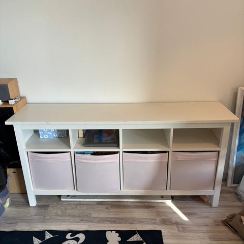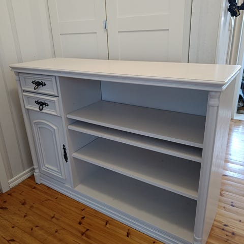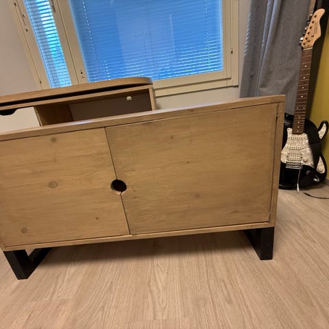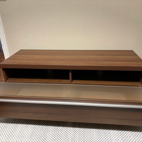 Siistissä kunnossa oleva senkki/ tv-taso. Merkistä ei tietoa. Valkoinen runko, maitolasi ovet puunvärisillä kehyksillä.