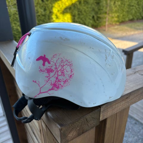 Uvex laskettelukypärä integroidulla visiirillä. Kypärässä on sininen ulkokuori ja pinkit hihnat sekä sisäpehmusteet. Sisäpuolella on pehmustettu vuori sekä säädettävä kiristyspanta takana. Leukahihnassa on pikasolki. Ollut käytössä kahdella lapsella noin kerran vuodessa laskettelureissussa. En löydä kokomerkintää mistään, mutta karkeasti mitattuna sisäosan ympärysmitta on 53cm ja kypärä on säädettävä. Meillä ollut käytössä 3-6- vuotiaana. Ei onnettomuuksia historiassa, mutta normaali käyttö. Päälaella hieman mustaa jälkeä (ks kuvat). Arvostetaan nopeita kauppoja! Vain nouto.