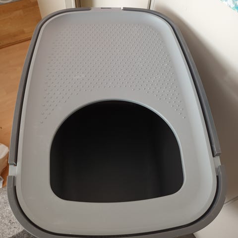 Kissanvessa ja avoin hiekkalaatikko. Toinen laatikoista on katettu malli, jossa on kulkuaukko ja yläosassa luukku. Toinen on matala, avoin hiekkalaatikko. Soveltuvat kissan tarpeiden hoitoon sisällä tai suojaisassa ulkotilassa. Materiaali muovia, väreinä vaaleanpunainen ja vaaleanharmaa.