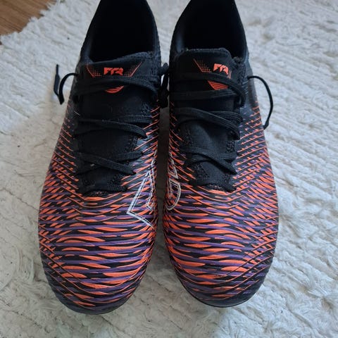 Puma jalkapallokengät, koko 40. Väri musta-oranssi violeteilla yksityiskohdilla. Nappulapohja on suunniteltu jalkapalloon nurmi- tai tekonurmialustalla. Nauhakiinnitys ja matalavartinen malli. Sopii jalkapallokäyttöön koon 40 jalalle.