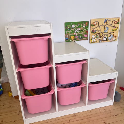 IKEA lastenhylly säilytyslaatikoilla. Valkoinen runko ja valkoisia sekä vaaleanpunaisia muovisia säilytyslaatikoita, jotka liukuvat urissa ja ovat irrotettavissa. Hylly koostuu porrastetusta rakenteesta, jossa on matalampi ja korkeampi taso. Sopii lastenhuoneen lelujen, askartelutarvikkeiden ja muiden pienten tavaroiden säilytykseen ja järjestelyyn. Todella pieniä käytön jälkiä