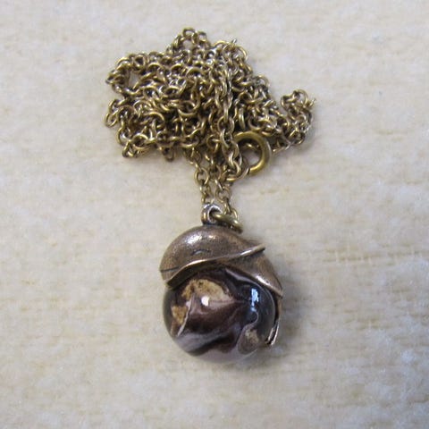 Käytössä ollut Kalevalan pronssinen Tintti kaulakoru. Keraamisen pallon väri on sinikirjava, ketjun pituus 80 cm. Rasiaa ei ole. Pakettiautomaattilähetys Manner-Suomeen 6 euroa, josta saa lähetyksen seurantanumeron. Nouto Kuopiosta keskustasta. En käytä ToriDiiliä.