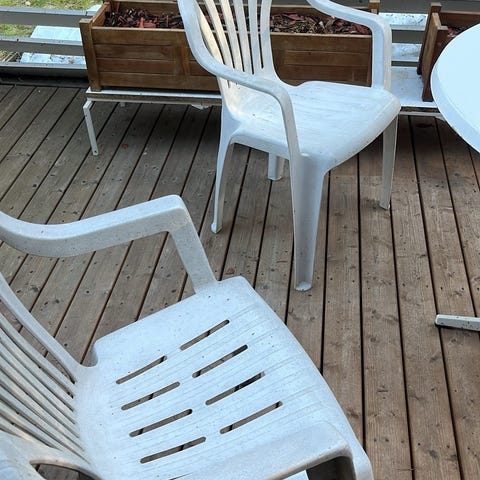 Puurunkoiset tuolit, joissa on kangasistuimet ja -selkänojat. Kangasosat ovat vaaleat ja niissä on suuri kukkakuvio. Tuoleissa on käsinojat ja ristiin menevät tukipuut jaloissa. Maalipinta on kulahtanut.