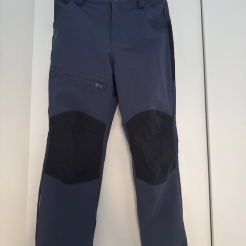 Siniset Reima kuorihousut hyvässä kunnossa. Ei mielestäni tunnu pehmentymää polvissa/pepussa. Polvessa haalea likajälki, en ole yrittänyt poistaa.