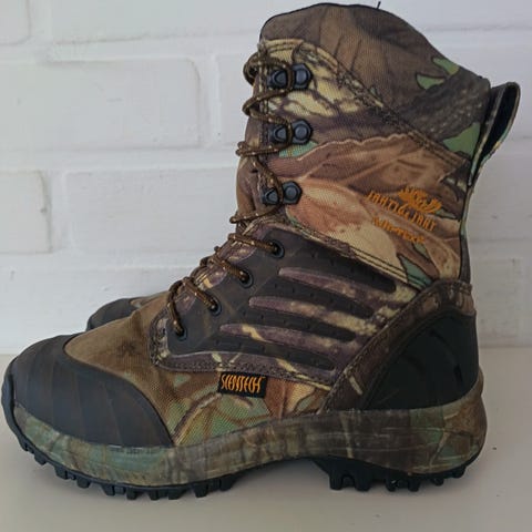 Jahti-Jakt Premium metsästyskengät, koko 40. Kengissä ruskea nahkapäällinen ja hengittävä Air-Tex -kalvo. Pohjassa karkea kumipohja, jossa Vibram-tyylinen kuviointi hyvää pitoa varten. Varressa pehmustettu rakenne ja nauhakiinnitys. Soveltuu metsästykseen ja muuhun ulkoiluun maastossa.