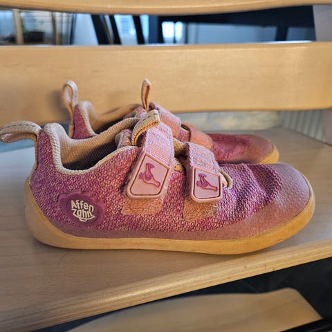Mustat varrelliset affenzahn paljasjalkakengät. Paikoin nirhaumaa mutta ei haittaa käyttöä. Koko 26.