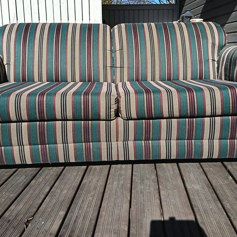 Jämäkkä vuodesohva hyvällä mekanismilla. Hyvä nukkua, mutta käytön jälkiä on. Sohva on ollut kissataloudessa, ja pientä raavinta jälkeä on tuossa sohvan reunoissa.