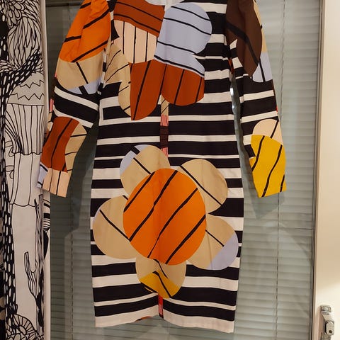 Ompelijalla vaatetuskankaasta teetetty mekko kokoa xs. Puhvihihat, takana avolaskos. Uudenveroinen kunto. Nouto Vihdistä tai Espoosta. Kulkeutuu Helsingin keskustaan.
