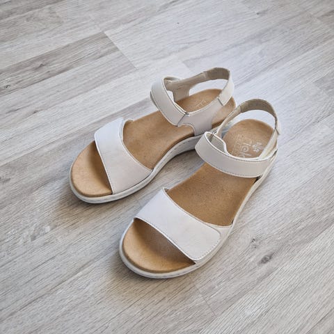 Rieker sandaalit, koko 38. Ruskeat remmisandaalit, joissa joustavat remmit ja korollinen pohja. Päällisosassa koristekiviä ja -helmiä. Pehmustettu sisäpohja lisää käyttömukavuutta. Soveltuvat arki- ja juhlakäyttöön lämpimään säähän.