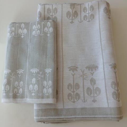 Hyväkuntoinen, tahraton, haalistumaton Tampellan puolipellava pöytäliina. Design Dora Jung. Pituus 188, leveys 134. Kääntöliina harmaa/ vaaleanharmaa. Viimeisessä kuvassa tämä liina ja pienempi kuvioinen liina,kooltaan 90×90cm Yrttitarha, 20e. Siitä erillinen ilmoitus Pöytäliina Dora Jung 90x90. Yhteensä nämä kaksi liina 70 euroa. Nouto tai postitus.