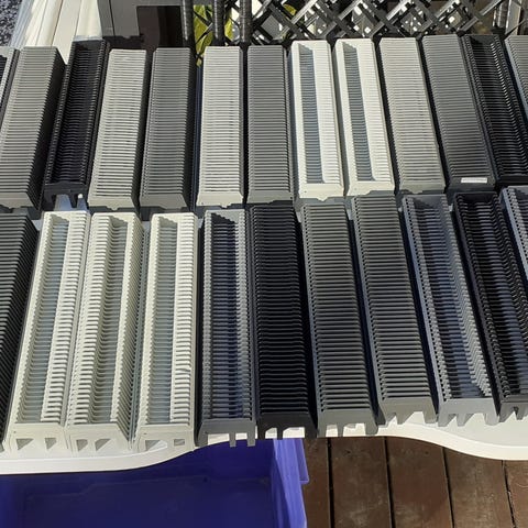Noin 60-luvulta - 80-luvulta, osa pahvikehyksellä osa muovisilla. 2 säilytyslaatikkoa ja 4 diakelkkaa. Pieni muovikotelo. Yhteishinta.