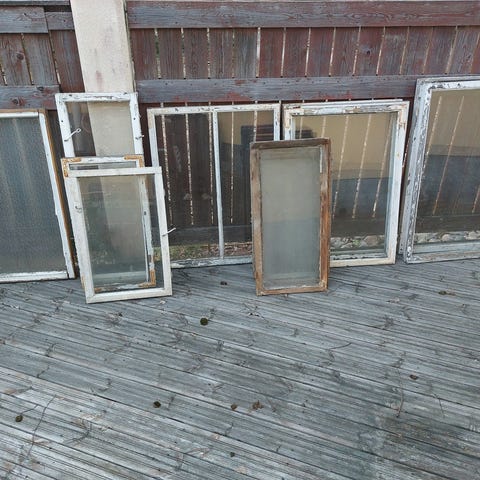 Aikanaan kellarin ikkunoiksi tehtyjä sisäikkunoita sekä pari ulkoikkunaa karmeineen odottaa uuttaa omistajaa. Yhteensä 12 kpl. Ikkunoiden koot (korkeus x leveys cm):