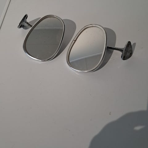Wanhan auton sivupeili. Automerkistä ei tietoa. Kunto hyvä, niklauksetkin vielä yllättävän komeat. Peili on pienentävä. Mitat: korkeus 15 cm, leveys 12 cm (peilin osuus), pituus 25 cm. Katsothan kuvat. Postitus onnistuu, hyvin pakaten.