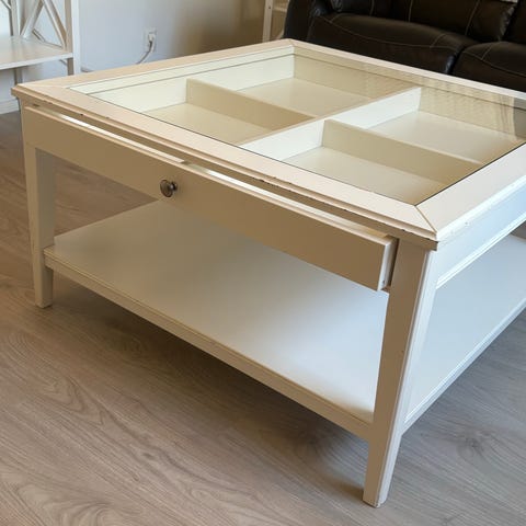 Valkoinen, klassinen malli lasikannella. Sisältää vetolaatikon ja alahyllyn säilytykseen.