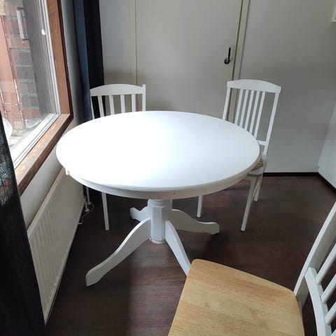 Valkoiseksi maalattu pyöreä pöytä, halkaisija 110cm. Pöydässä jatkomahdollisuus, mutta meillä ei ole pöytään kuuluvaa jatkopalaa. Täyttä mäntyä. Pöydän kansi höylätty reilu vuosi sitten ja sen jälkeen kokonaisuudessaan valkoiseksi maalattu. Pieniä käytön jälkiä kannessa ja jaloissa.