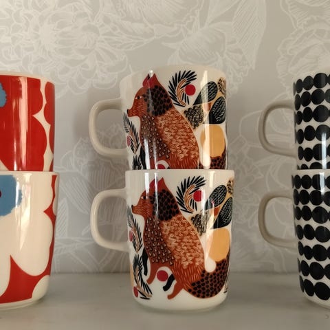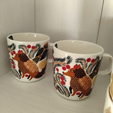 Mukeja on käytetty muutaman kerran, pesty käsin. Uudenveroiset. Lautaset ovat uudet, tarrat vielä kiinni.