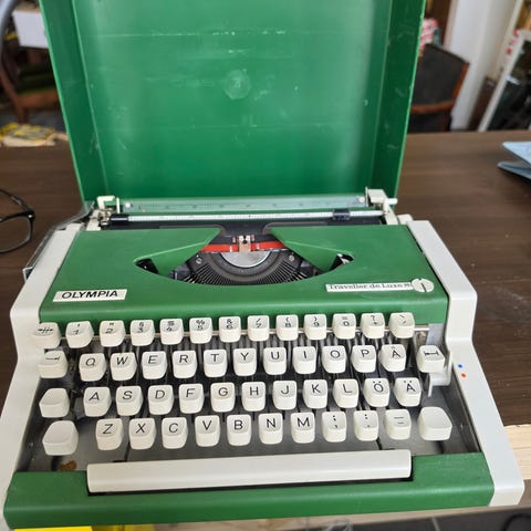 Olympia kirjoituskone musta. Perinteinen mekaaninen pöytämalli, jossa erilliset näppäimet ja metallinen runko. Sopii esimerkiksi kirjoittamiseen, keräilyyn tai sisustuselementiksi. Näppäimistö ja rullamekanismi näkyvät kuvassa, kone on kokonaan musta metallipintainen malli.