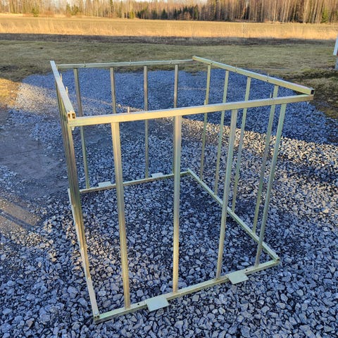 Metallinen laituri runko ja ponttoonit. Kuvissa näkyy koottava metallirunko, useita metallisia kansielementtejä sekä useampi ponttoonisäiliö. Mukana on piirros mittoineen, josta ilmenevät laiturin suunnitellut pituus- ja korkeusmitat. Sopii vesirajaan asennettavan laiturin tai muun kelluvan rakenteen rakentamiseen tai kunnostukseen. Materiaali pääosin metallia ja muovia (ponttoonit). Merkit ja tarkat mallit eivät ole tiedossa.