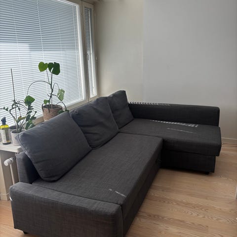 Tummanharmaa jämäkkä divaanisohva (päivänvalokuvat voivat hämätä, tasavärinen yksilö), jolle tekoäly tarjoaa eri vaihtoehtoja - saattaa olla IKEA: n divaani tai sitten ei, tekoälyn mukaan. (Tori-sovellus tarjosi IKEA: a)