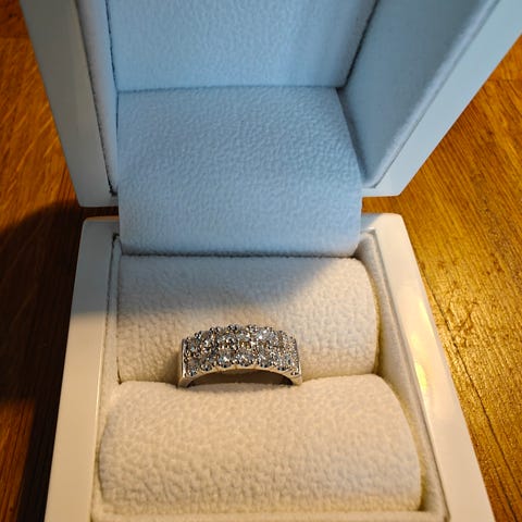 Kohinoor naisten sormus, valmistettu 14k valkokullasta ja koristeltu timanteilla. Sormuksessa on 14 mustatimanttia sormuksen ympäri, ja sisäpinnassa näkyvät kaiverrukset ja leimat. Sopii käytettäväksi esimerkiksi arki- tai juhlasormuksena tai vihki- tai kihlasormuksena käyttäjän tarpeen mukaan. Paino 2,14 gr ,koko 16,5.