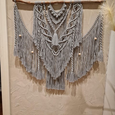 Makramee seinävaate. Korkeus 100cm. Kepin pituus 90cm. Värinä ruskea ja luonnonvalkoinen . Puuvilla makramelanka.