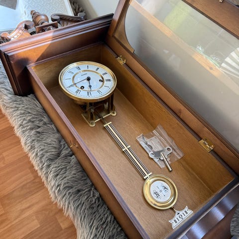 Puinen seinäkello, jossa on heiluri ja mekaaninen koneisto. Kellossa on pyöreä valkoinen kellotaulu arabialaisin numeroin ja mustin viisarein. Kotelo on tummaksi sävytettyä puuta ja alaosassa on lasi-ikkuna, josta heiluri näkyy. Sopii käytettäväksi seinälle ripustettavana kellona esimerkiksi kotiin tai mökille.
