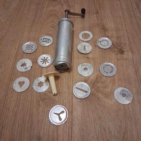 Alumiininen, vanha pikkuleipäpursotin. 10 erilaista pursotinmuottia. Kumitulppa kovettunut, mutta käy malliksi uuteen. Kotelosta puuttuu kansi ja kotelossa halkeamia.