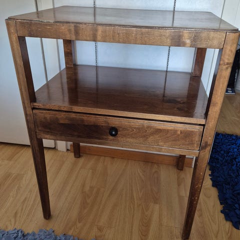 Sasu’s playhousen pieni pöytä. Yksi laatikko. Päällä lasilevy jonka läpi näkee laatikkoon
