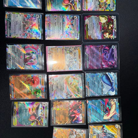 Myydään Pokémon-kortteja pakettina tai erikseen. Mukana V-, VMAX-, EX-, Illustration Rare sekä muita erikoiskortteja.