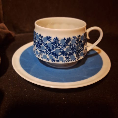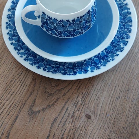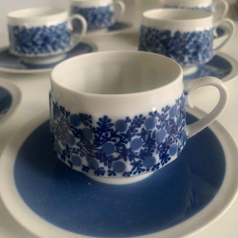 Arabia kahviastiasto, jossa sinivalkoinen kukkakuvio ja yksivärinen sininen keskiosa. Kokonaisuuteen kuuluu useita kahvikuppeja, tasseja ja lautasia. Kolme kuppia lautasineen ja 1 kuppi ilman lautasia. Astiat ovat posliinia ja sopivat kahvi- tai teehetkiin arkeen ja juhlaan. Kuviointi on sinisellä valkoisella pohjalla, ja lautaset sekä kupit ovat yhteensopivaa sarjaa.
