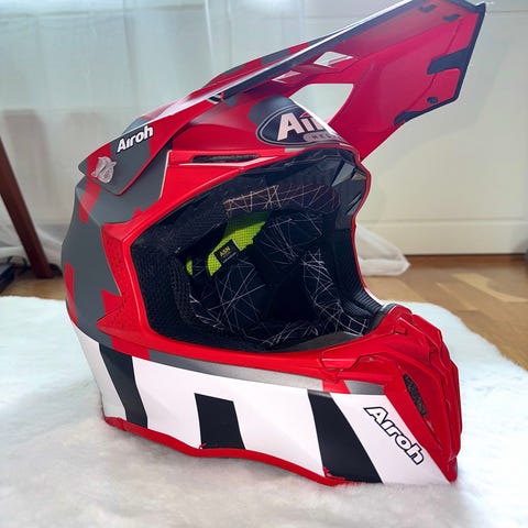 Airoh motocrosskypärä musta ( ovh 150€ ) Kypärässä on pitkä lippa ja täyskypärämalli, joka suojaa leukaa ja päätä. Ulkopinta on mattamusta, ja siinä on Airoh-logot. Kypärä soveltuu esimerkiksi motocrossiin tai enduroajoon. Kuvista näkyy ulkopinnan naarmuja ja käytön jälkiä. Koko M. Lasit saa mukaan ( ovh 35€ ).