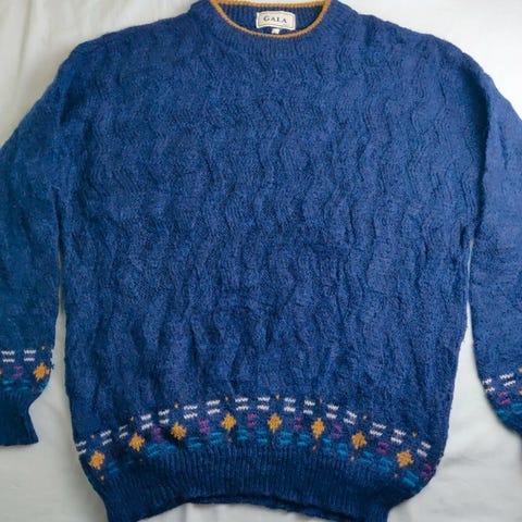 Miesten / unisex sininen retrootteinen neule, jossa on hieman pörröinen pinta.