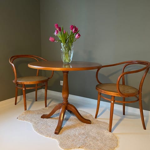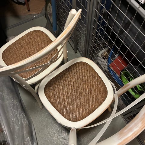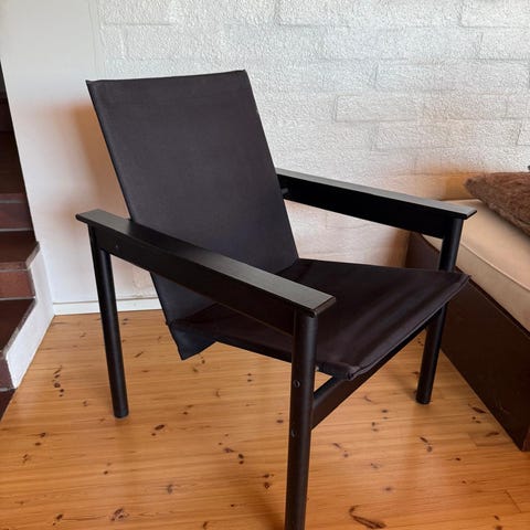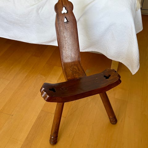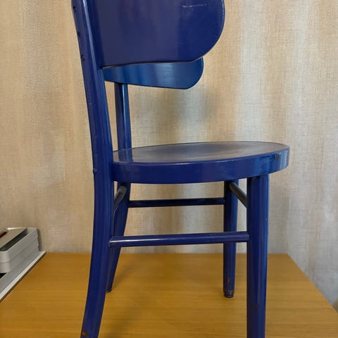 Pentti Hakalan suunnittelema W-tuoli (1985). Ikään kuuluvaa kulumaa, mutta yleiskunto hyvä.