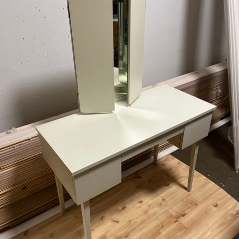 Valkoinen kampaus/kirjoituspöytä. Kolme osaa.Kaappi ja laatikosto. Keskellä avattava peili ja laatikko, jonka voi sulkea. Nouto.