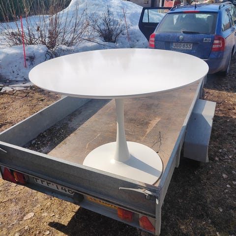 Pöydän halkaisija n. 100 cm. Pöytäpinta vaatii korjausta.