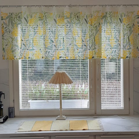 2 kappaletta samankokoista verhokappaa. Yhden kapan leveys on 73 cm ja pituus katosta lattiaan on 352 cm. Hieno ja liukas rypistymätön kangaslaatu.