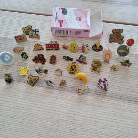 Sekalainen kokoelma erikokoisia ja -muotoisia rintanappeja ja pinssejä. Mukana on sekä pyöreitä rintanappeja että metallisia pinssejä erilaisilla kuvioilla ja teksteillä. Osa tuotteista on värillisiä emalipinssejä, osa painettuja rintanappeja. Kokoelma soveltuu esimerkiksi keräilyyn tai asusteiden, laukkujen ja vaatteiden koristeluun. Myydään yhtenä eränä kuvien mukaisena kokonaisuutena.