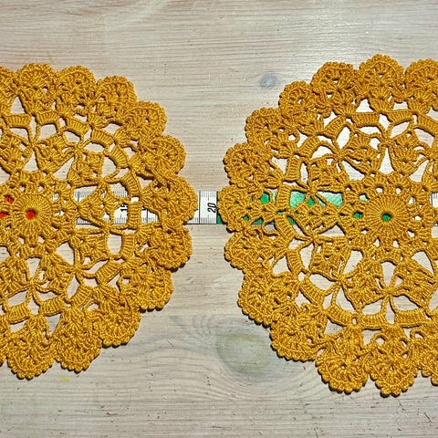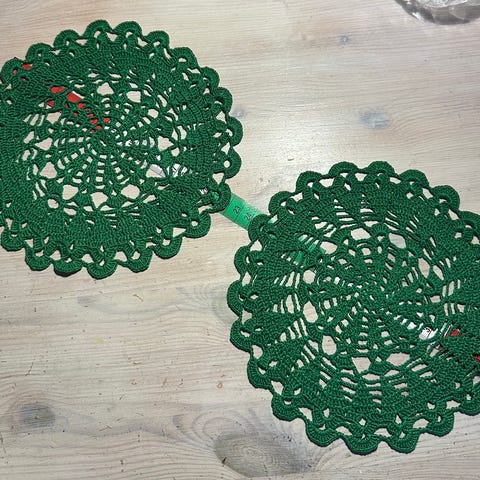 Materiaali vaikuttaa olevan ohutta lankaa, todennäköisesti puuvillaa tai vastaavaa. Myydään settinä kuvien mukaisesti.