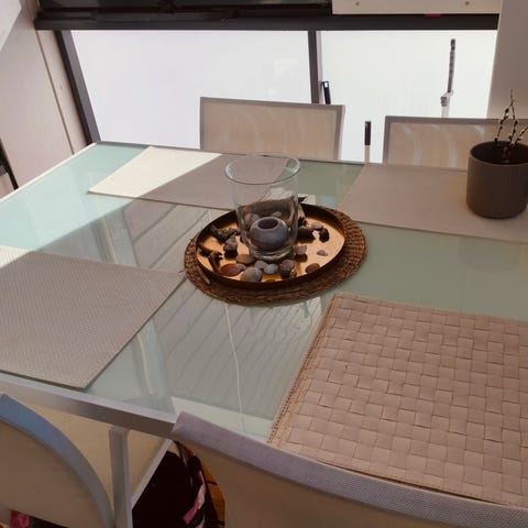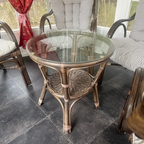 Parvekekalustesetti, johon kuuluu pyöreä lasikantinen pöytä ja kaksi tuolia. Pöydässä on metallirunko ja läpinäkyvä lasitaso. Tuoleissa on metallirunko ja punottu istuin- ja selkäosa. Sopii parvekkeelle tai terassille ulkokäyttöön.