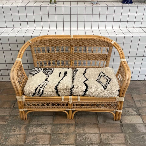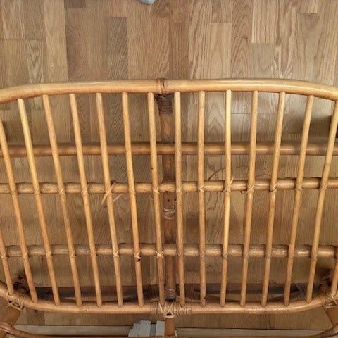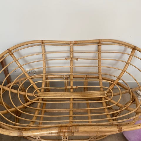 Laistetulla parvekkeella säilytetty rottinkisohva. Mitat: korkeus 76 cm, leveys 116cm, syvyys 68cm. Helppo ja kevyt kuljettaa.