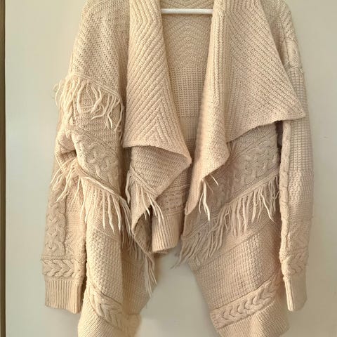 Myydään Pull&Bearin harmaa meleerattu neuletakki. Ostettu aikoinaan Budapestista, aikana kun kyseistä liikettä ei ollut vielä Suomessa. Paljon pidetty ja tästä muistona pari karannutta lankaa (näistä kuva). Kunto muuten siisti käytetty.