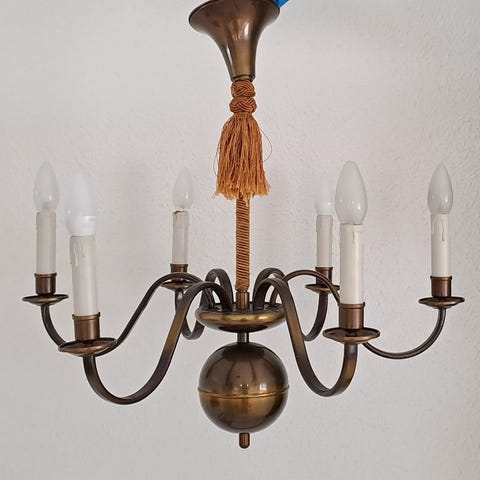 Vintage-messinkivalaisin hapsuvarjostimella (n. 1950-luku)